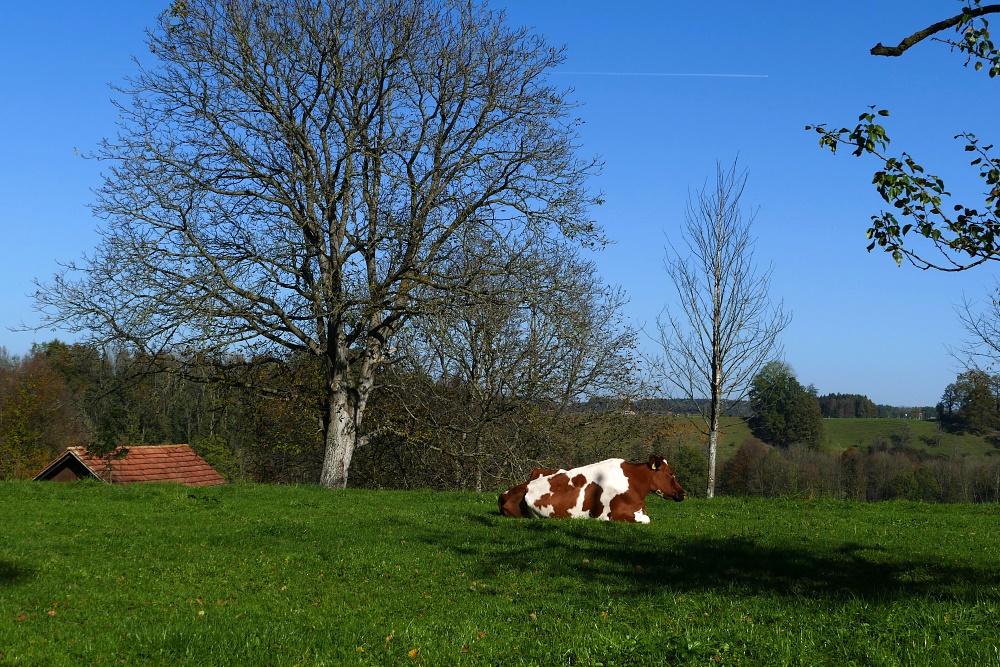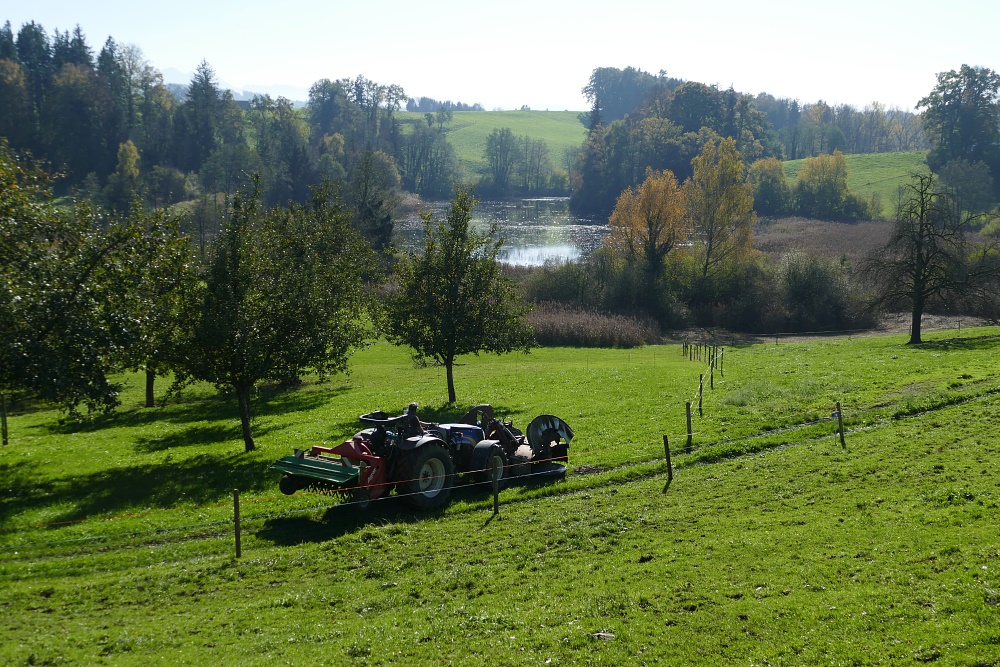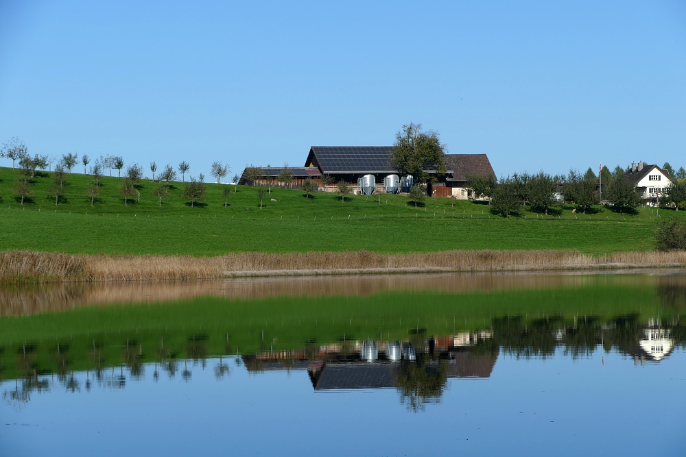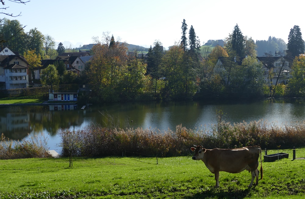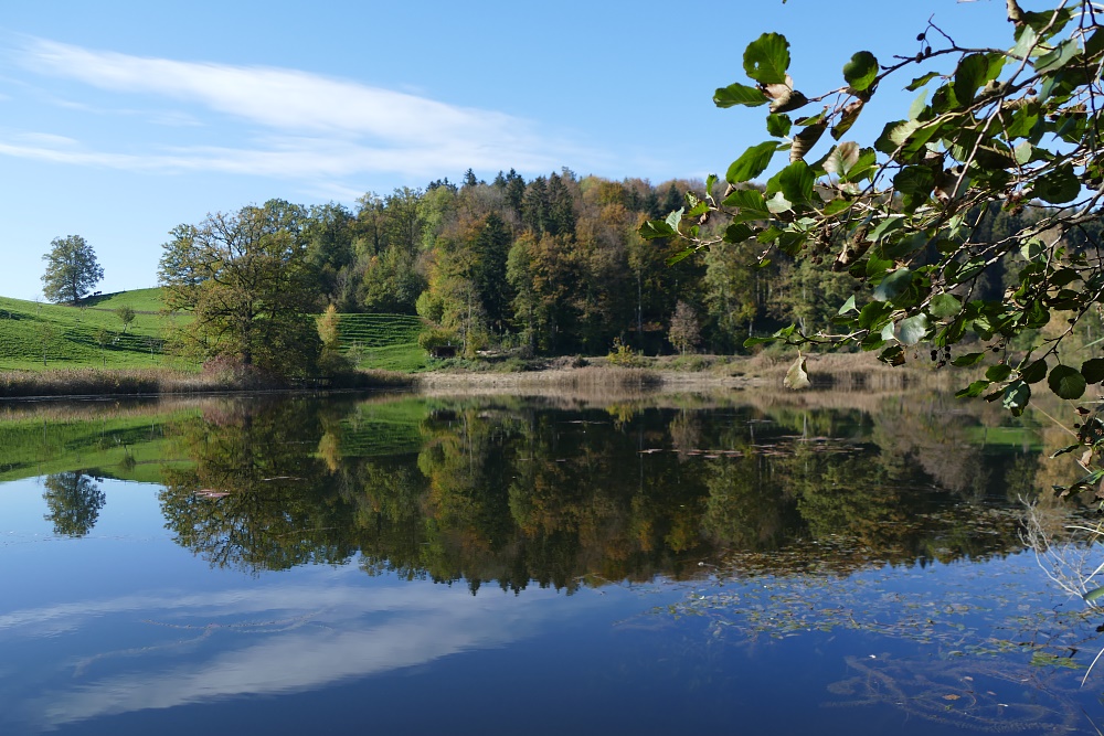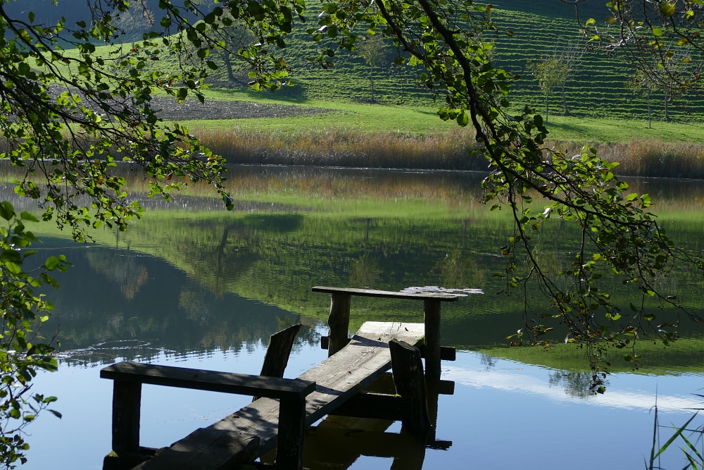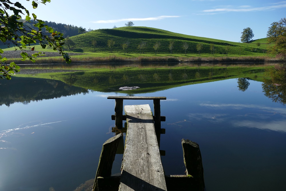 Nachdem wir den Wald hinter uns gelassen haben, schließt sich die Runde und wir erblicken wieder Hauptwil, unseren Ausgangspunkt. Hier liegt auch der letzte der fünf Weier, der Hauptwiler Weier.