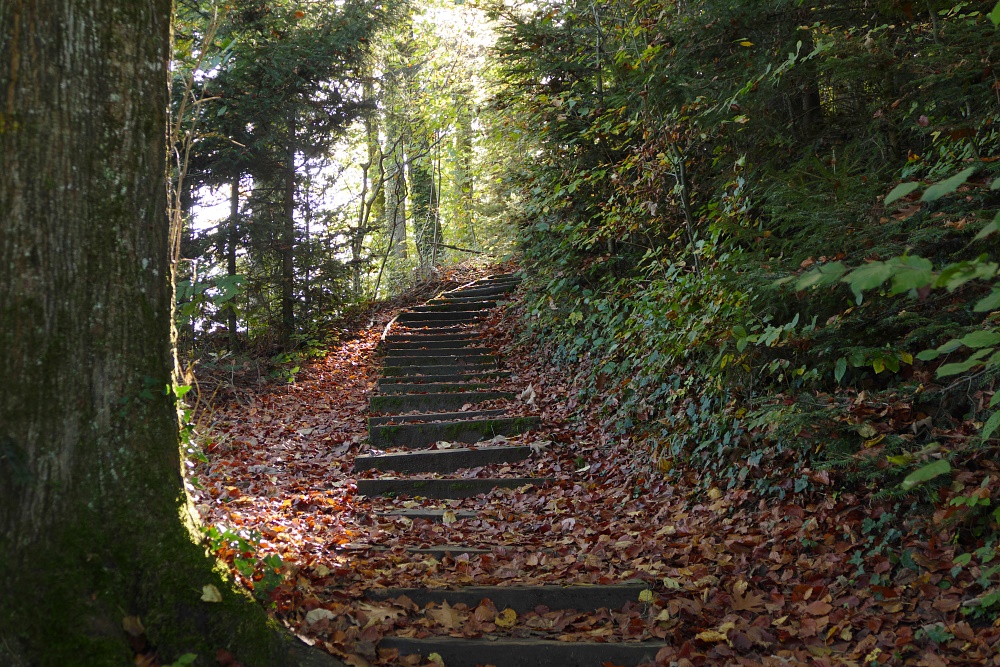 vom Gwandweier führt eine lange Treppe aufwärts in den Wald.