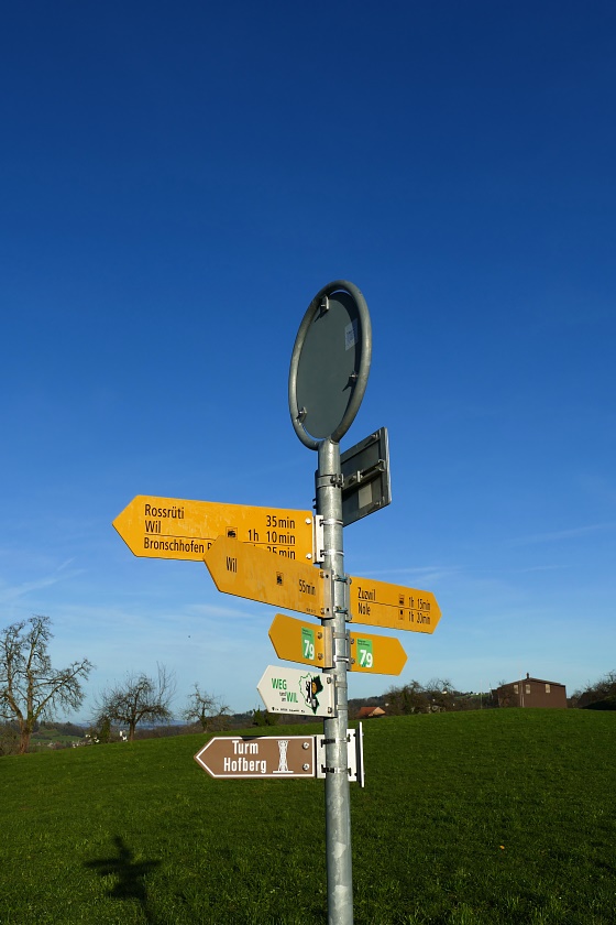 Die Runde startet am kleinen Philosophenweg-Parkplatz kurz vor Zuznach. Hier gelangt man nach wenigen Schritten auf die Etappe Nr. 2 des Thurgauer Panoramaweges, die von Bischofszell nach Wil führt.