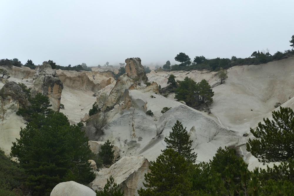 Der Weg führt nun zunächst hoch zu einem Pass auf 1600 m Höhe. Faszinierende helle Felsformationen lassen mich trotz des tiefhängenden Nebels staunen.