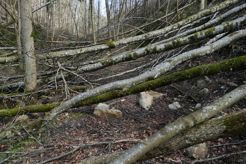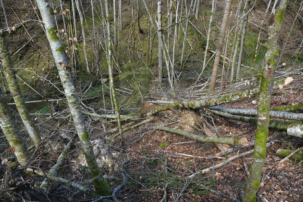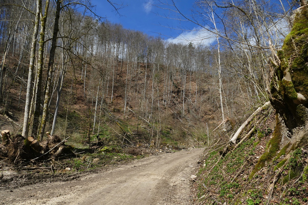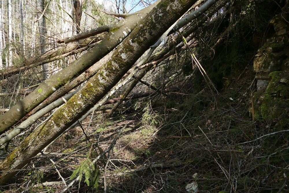 Völlig unvermittelt stehe ich vor den Zeichen massiven Windbruches. Die ersten Meter ist es noch relativ einfach, die blockierenden Baumstämme zu überwinden, aber bereits kurz darauf ist der Windbruch so dicht, dass ein solches Unterfangen lebensgefährlich wäre. Später, am Ausgang der Schlucht, bemerke ich ein Warnschild, aber aus Richtung Eigeltingen fehlt ein solches.