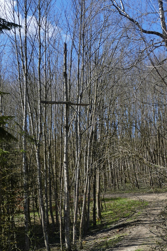 Kurz führt der Weg nun am Waldrand entlang. In der Ferne ist das Schwedenkreuz des Pfarrers Johann Hertz zu erkennen.