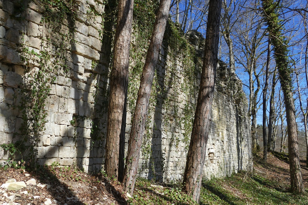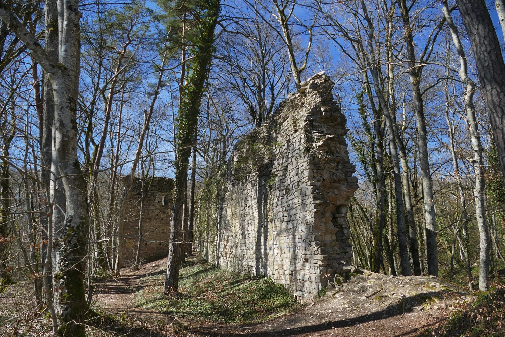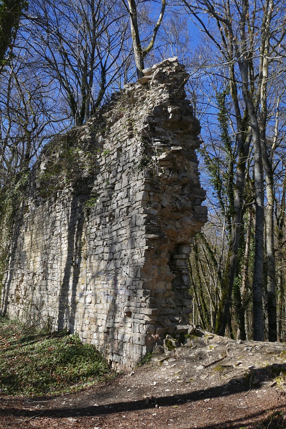 Beim Parkplatz taucht der Wanderweg wieder in den Wald ein und führt nach kurzer Strecke zur Ruine Tudoburg.