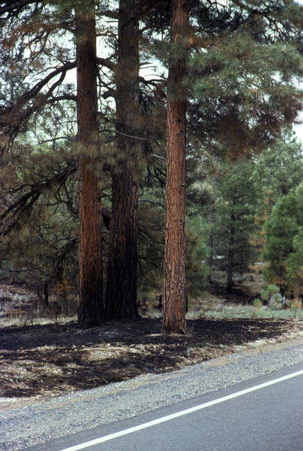 Untergrund und Stämme zeigen Brandspuren - in diesem Fall von einem sogenannten controlled burn, der von der Nationalpark-Verwaltung absichtlich gelegt wird, um zu verhindern, dass durch natürliche Ursachen ausgelöste Brände ein verheerendes Ausmaß erreichen können.