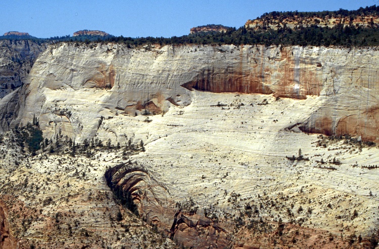 Auf dem Abstiegsweg vom Observation Point: wenn man genau hinsieht, erkennt man an der Spitze der senkrechten Felswand eine Konstruktion nicht natürlichen Ursprungs. Es handelt sich dabei um die Bergstation, eine Art Holzbock, über die in der Anfangszeit die geschlagenen Holzstämme an Telefondrähten ins Tal abgeseilt wurden.
