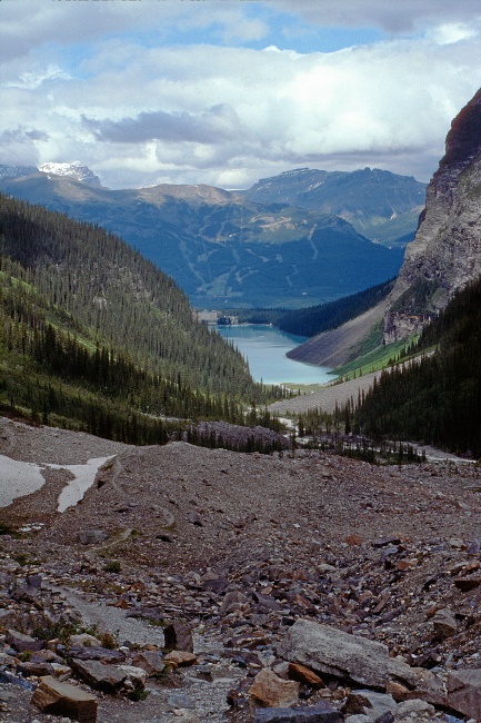 Nach einem kurzen Anstieg hat man einen beeindruckenden Blick hinunter auf den Lake Louise und seinem weltberühmten Hotel. Am Lake Louise sind die schneereichen Winter eher mild, da die arktischen Tiefdruckgebiete zwar durch das Bow Valley fegen, aber meistens das Gebiet um den Lake Louisa verschonen. Kein Wunder, dass dieses Gebiet so beliebt ist.