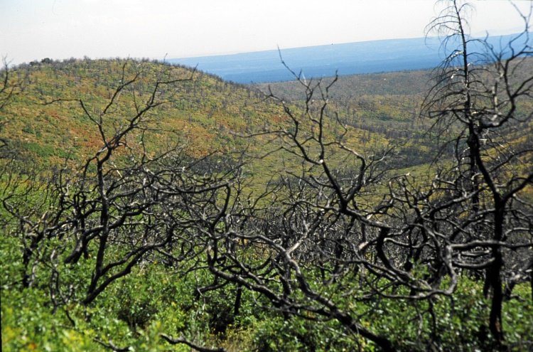 Hier hat die Vegetation schon einen Teil der Brandnarben mit einem grünen Unterholz-Teppich zugedeckt.