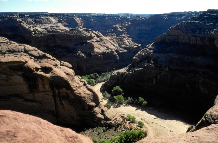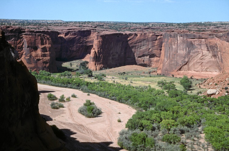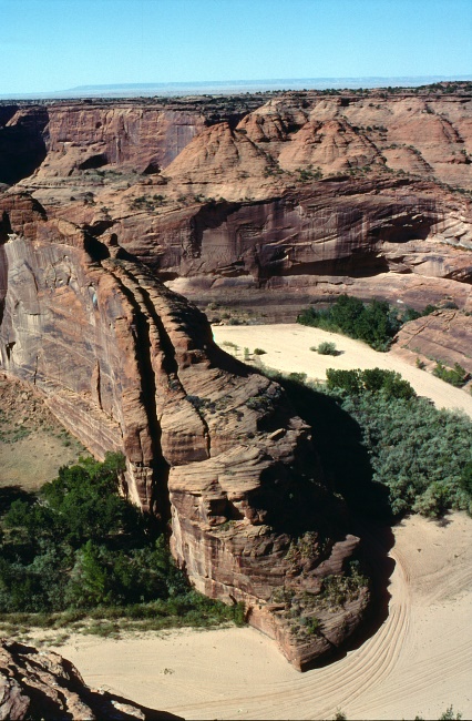 Ich will aber heute noch Richtung Canyon de Chelly weiterfahren. Zunächst ist die Straße noch geteert, geht dann aber in eine Schotterpiste über, die sich immer mehr Richtung Passhöhe windet und eher schwer zu befahren ist. Mir wird auch immer unheimlicher, insbesondere als ein Auto hinter mir aufschließt und trotz meiner langsamen Fahrt und der Staubfahne hinter mir einfach nicht überholen will. Ich befürchte schon das Schlimmste in dieser gottverlassenen Gegend, halte schließlich an und ergebe mich in mein Schicksal. Der Indianer steigt auch prompt aus - und fragt mich bedauernd, ob ich mich wohl verfahren hätte? Nachdem ich verneint habe, fahren wir beide weiter und erreichen bald die Passhöhe, nach der sich die Straßenverhältnisse bald bessern.