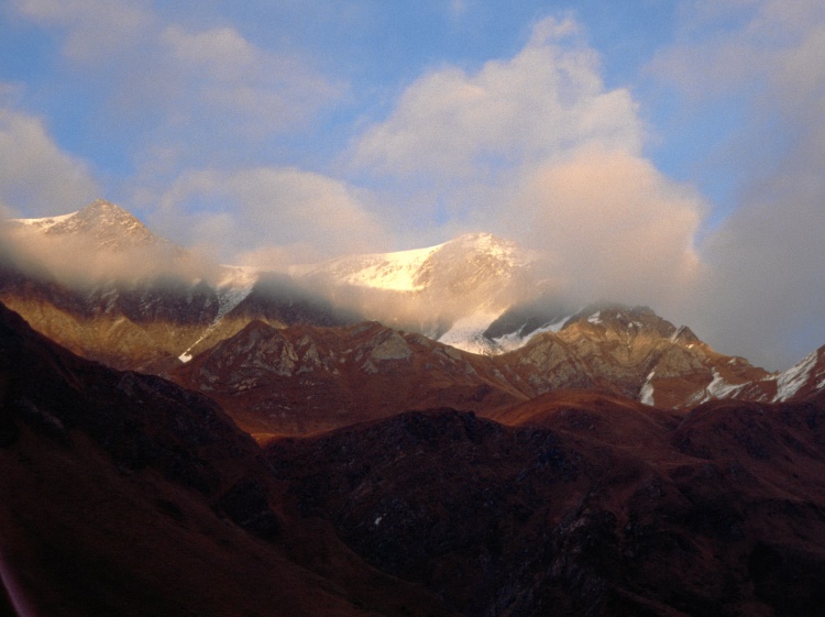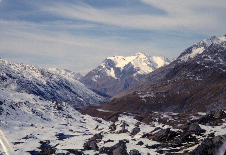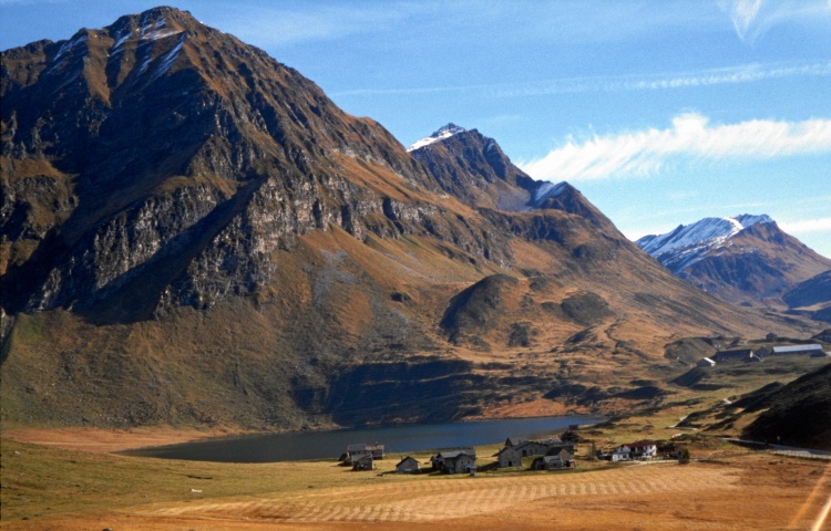 Blick zu den Berggipfeln oberhalb des Lukmanierpasses (Scopi 3190 m, und andere)