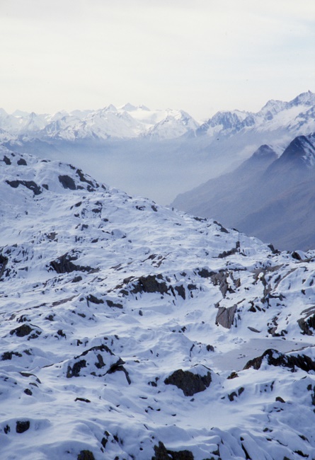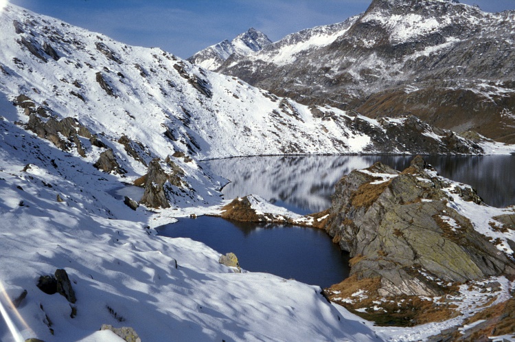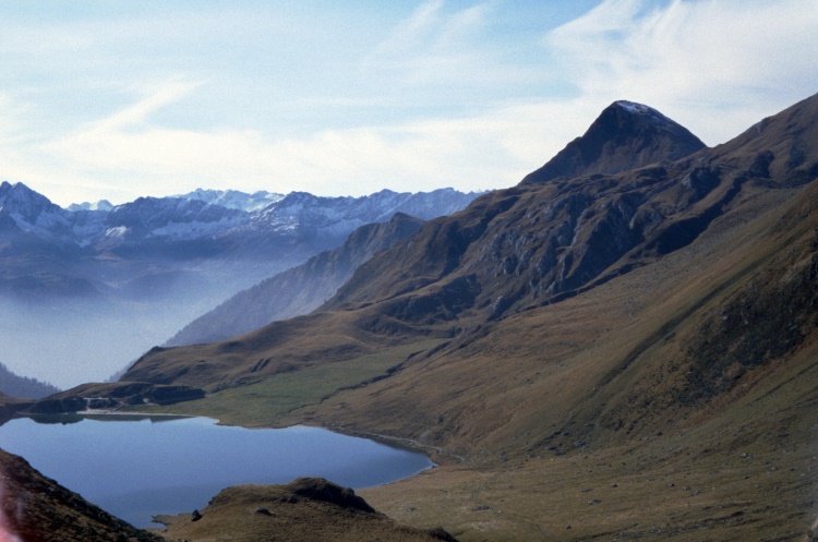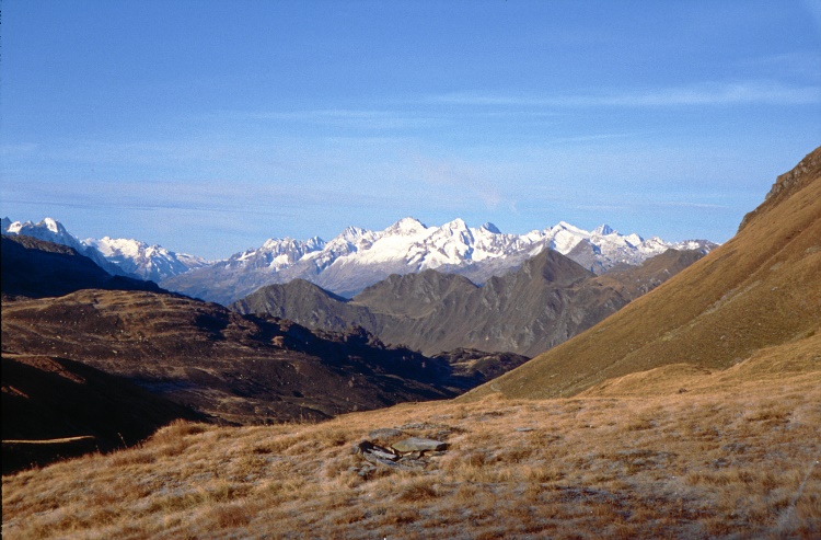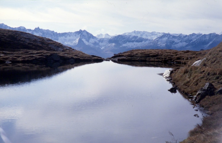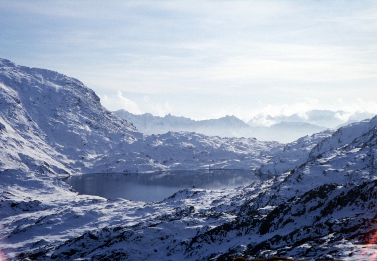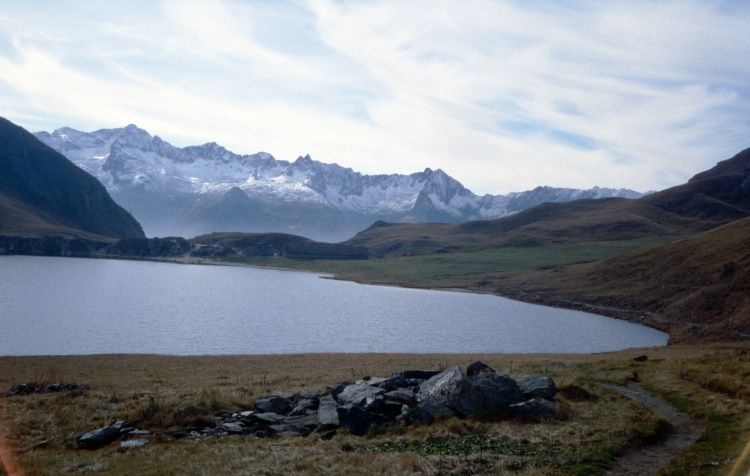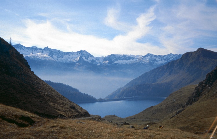 Nun geht es zunächst am Stausee entlang. Danach biege ich ab ins Val Termine, wo der Wanderweg bis zum Passo dell'Uomo ansteigt, um dann auf eine hochgelegene Ebene abzubiegen. Von dort hat man eine grandiose Aussicht auf die Berner Eisriesen. Sogar Mönch und Finsteraarhorn wären auszumachen, wenn man denn die Silhouetten erkennen würde. Im Vordergrund und ohne Schneehaube ist schon die Bergkette nördlich des Ritómsees mit Camoghè, Pizzo Tom und Monte Stabiello zu erkennen.