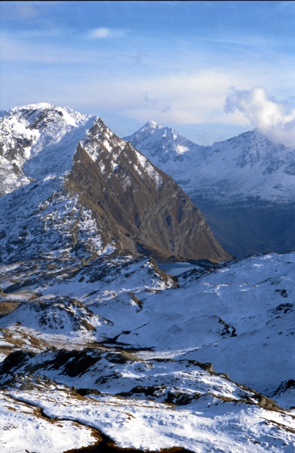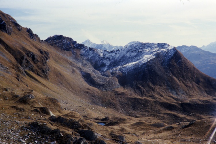 Von links nach rechts: Punkt 2240 (breiter gezackter Gipfel), Camoghé (Pyramide), Pizzo Tom, Pizzo Stabiello (mit zwei Spitzen, rechts). Vor dem Gebirgszug liegt noch - etwas schlecht zu erkennen - der aus dieser Position heraus als Hügel erscheinende Motta (Schneereste an der Ostflanke, genau darüber der Pizzo Tom) mit immerhin 2115 m