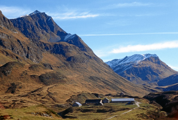 Im Hintergrund der Schenadüi (2747 m, schneebedeckte Spitze, links) und der Pizzo dell'Uomo (2663 m, schneebedeckt, rechts)