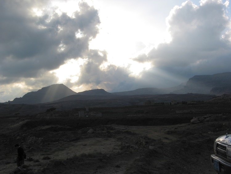 Unser heutiger Lagerplatz liegt dieses Mal etwas abgelegen in einer kuhlenartigen Vertiefung. Das ist recht bewusst so gewählt, denn zum einen wird im Umland gerade eine große Hochzeit gefeiert, zum anderen stehen in diesem Khat-Anbaugebiet überall Wachtürme, die auch mit bewaffneten Wächtern besetzt sind. Eine Hochzeit ist für die Einheimischen ein willkommener Anlass, ihre Waffen mal für Freudensschüsse einzusetzen. Aber da kann sich auch mal eine Kugel verirren und so ist die Idee hier, durch das tiefliegende Terrain einigermaßen davor geschützt zu sein.