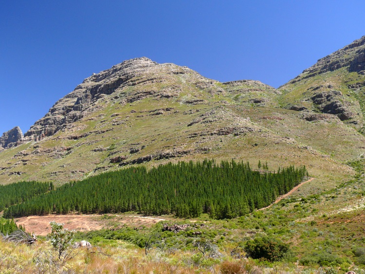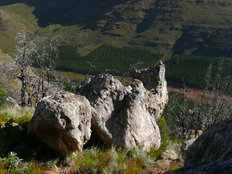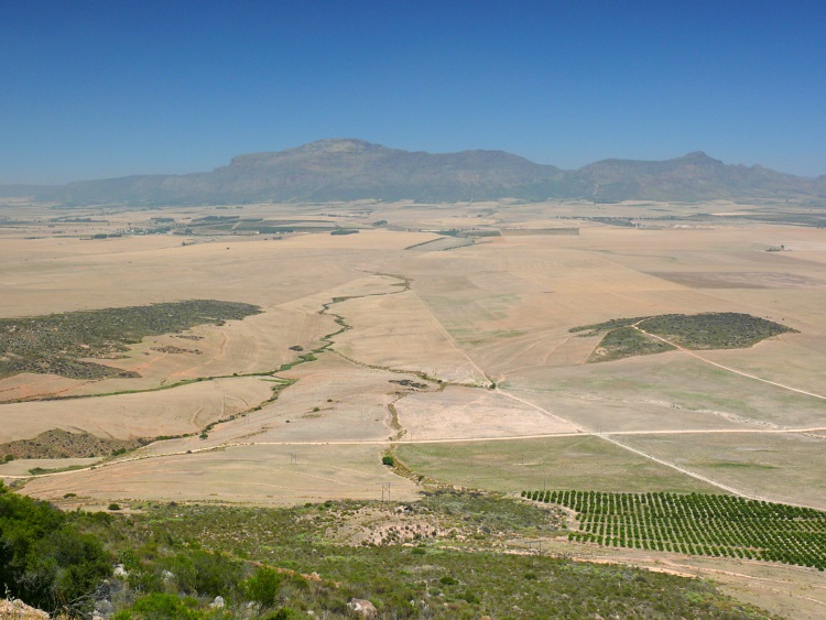 Nun geht es weiter Richtung Cederberge. Dazu müssen wir einen Bergrücken überwinden, um nach Citrusdal zu gelangen. Auf dem langen Anstiegsweg halten wir kurz, um die gute Aussicht auf die weit unter uns gelegene Ebene und die Berge zu bestaunen.