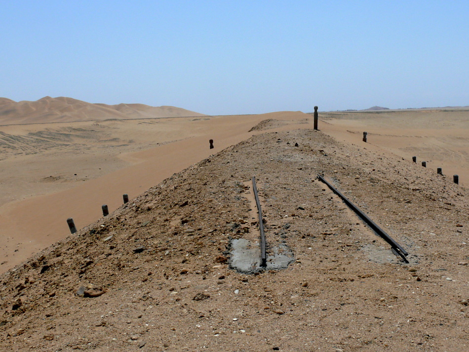 Ein Denkmal an die Eisenbahngeschichte Namibias: Die erste (für die Öffentlichkeit vorgesehene) Eisenbahnlinie wurde 1897 - 1899 von den Engländern erbaut und führte von Walfishbay ins etwa 15 km entfernte Plum.
