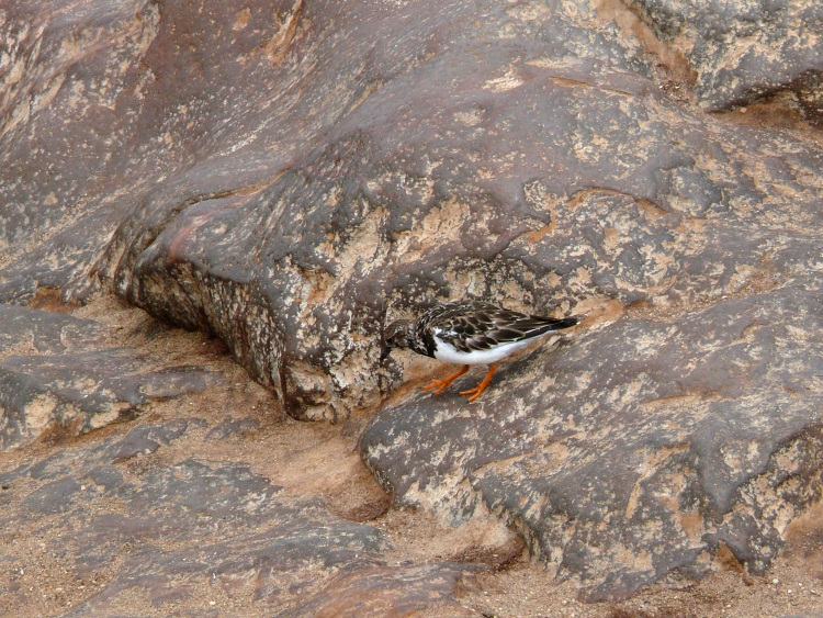 Der kleine Vogel interessiert sich nicht für die Robben oder Möven sondern für kleine Lebewesen, die sich unter den Steinen verbergen. Passenderweise wird diese Vogelart (Arenaria interpres) auch Steinwälzer genannt, weil der Vogel auf Nahrungssuche an der Küste mit seinem harten Schnabel Steine und Muscheln umdreht.