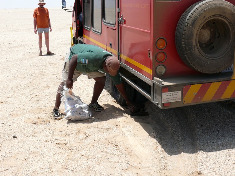 Und es kostet viel Mühe, das Fahrzeug wieder herauszuziehen. In unserem Fall führten alle mitgeführten Hilfsmittel nur dazu, dass sich das Hinterrad noch tiefer eingrub. Zum Glück sind die Einheimischen hier sehr hilfsbereit und so erledigte ein Jeepfahrer das, was alle unsere Bemühungen nicht geschafft hatten, mit seinem Abschleppseil in Windeseile.