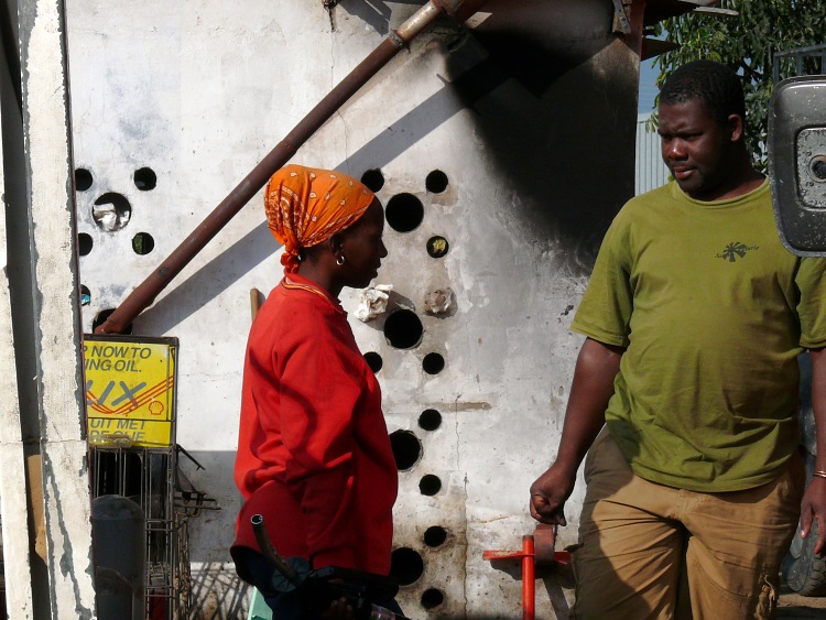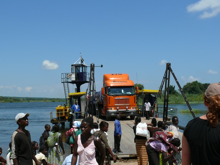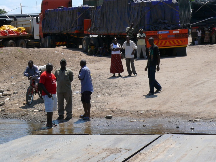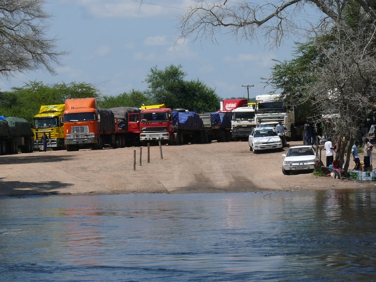 Am späten Vormittag erreichen wir das namibische Ufer des Sambesi, wo schon LKW-Schlangen auf ein Übersetzen ans andere Ufer warten.