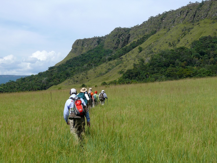 Ein letzter Blick auf die Hütten von Kavak. Unsere Gruppe hat sich etwas verkleinert, denn wir lassen ein Ehepaar zurück. Der Mann hatte sich beim Aufstieg auf den Temen Tepui bereits am ersten Wandertag einen Muskelfaserriss zugezogen. Wir werden die beiden erst wieder nach dem Abstieg vom Tafelberg hier wiedertreffen.
