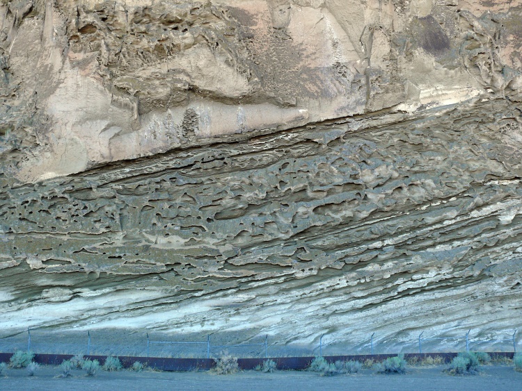 Nach halbstündiger Fahrt entlang des Tule Lakes erreichen wir den Startpunkt für die Petroglyph Point Trail. Hier die löcherdurchzogene Bergflanke. Zur Größeneinordnung: Am unteren Bildrand verläuft ein knapp 2m hoher Zaun.