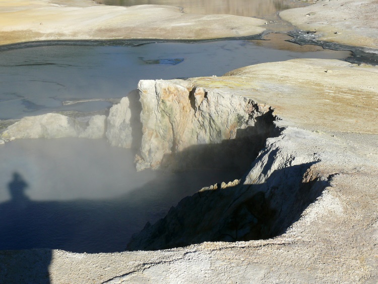 Abfluss in der Bumpass Hell. Der gelbe Bakterien- oder Algenbewuchs ist typisch für solch warme, schwefelhaltige Thermalquellen.
