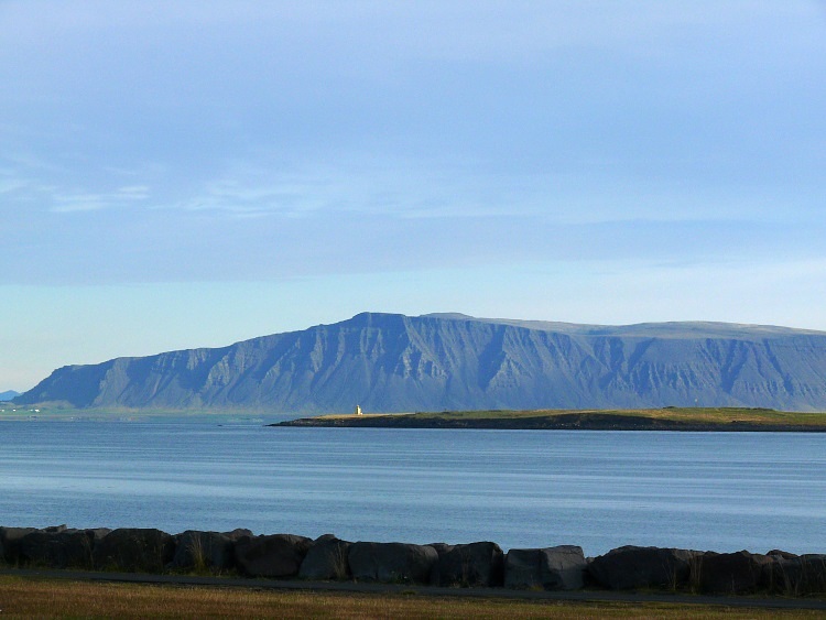 Blick auf die Reykjavik im Norden vorgelagerte Insel Engey mit dem gelben Leuchtturm auf der Inselspitze, dahinter die Steilküste des Festlandes.