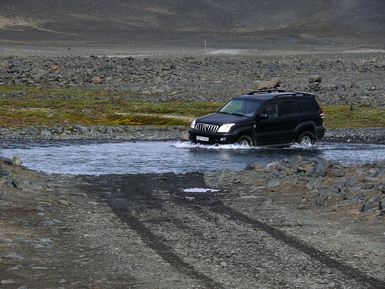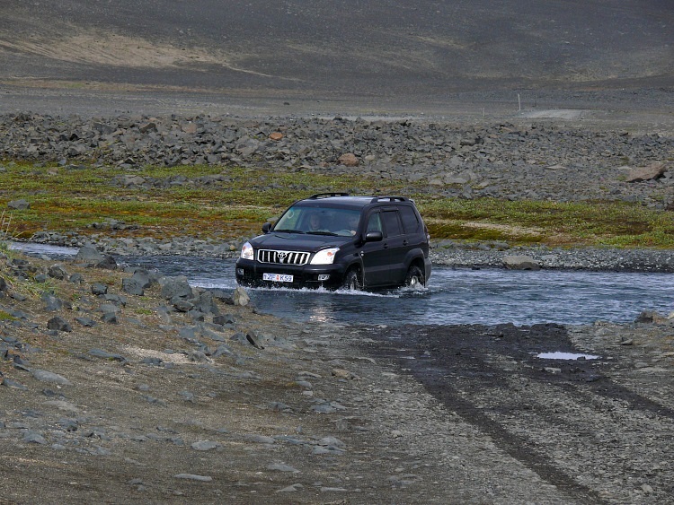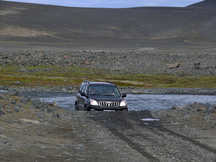 Nun geht es weiter auf einer Schotterpiste Richtung Kverkfjöll. Öfters sind mehr oder weniger reißende Flüsse zu überqueren.