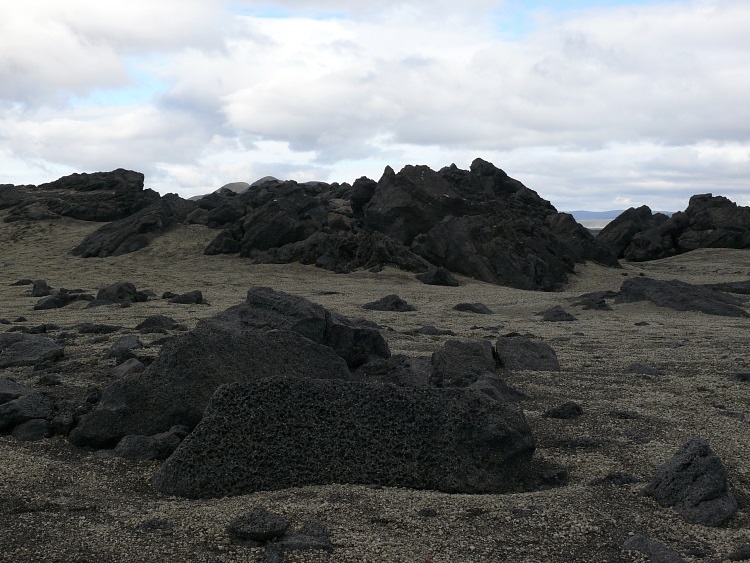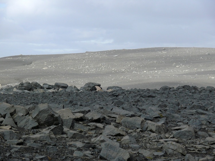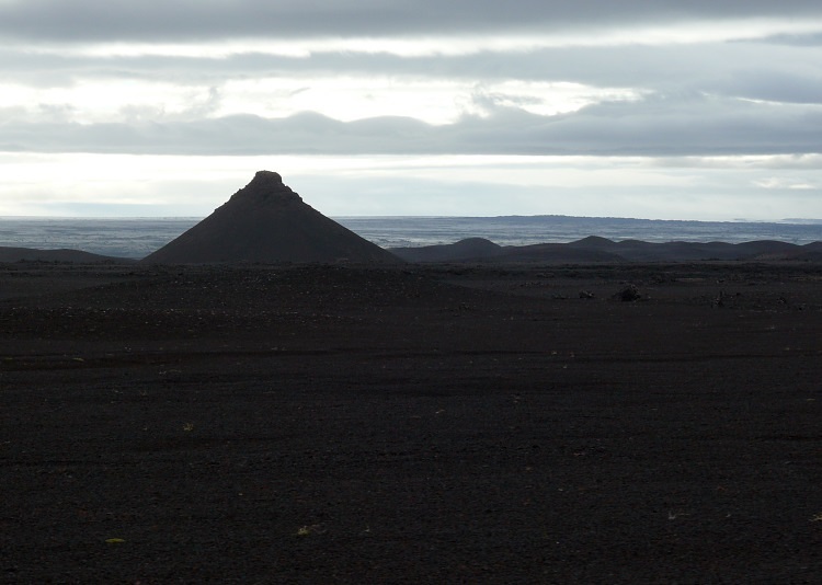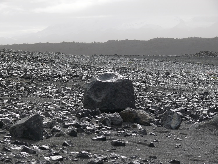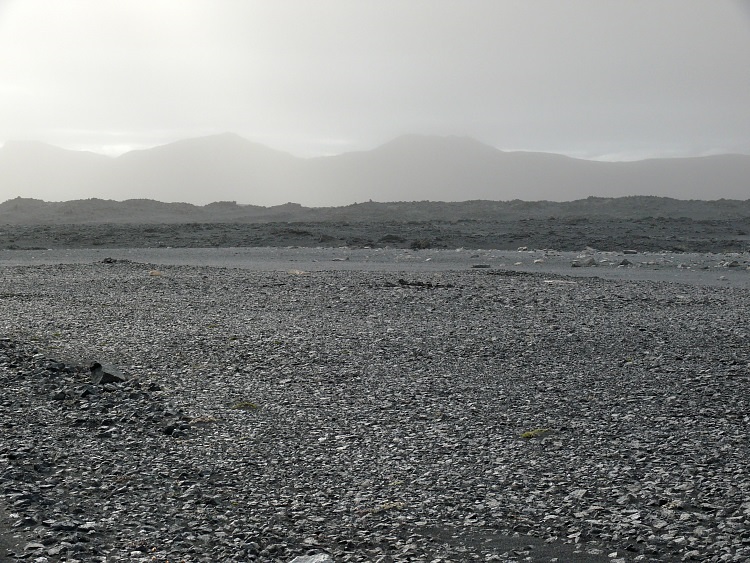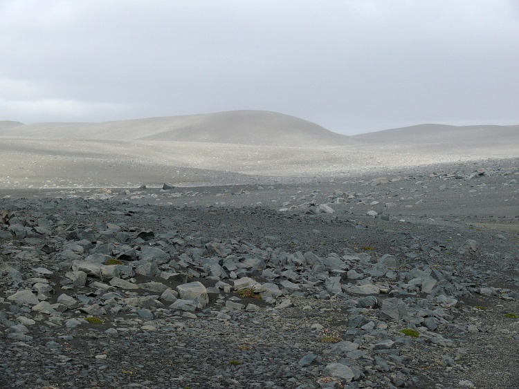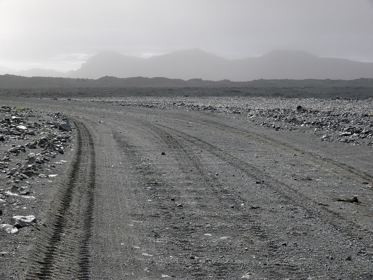 Auf dem Weg zum Kverkfjöll. Die Folgen eines Sandsturmes lassen alle Konturen verschwimmen. Die feinen Partikel, die noch nicht wieder auf den Boden gesunken sind, lassen nur noch ein diffuses Licht durch, die ganze Landschaft erscheint in einem einheitlichen Grau in Grau.
