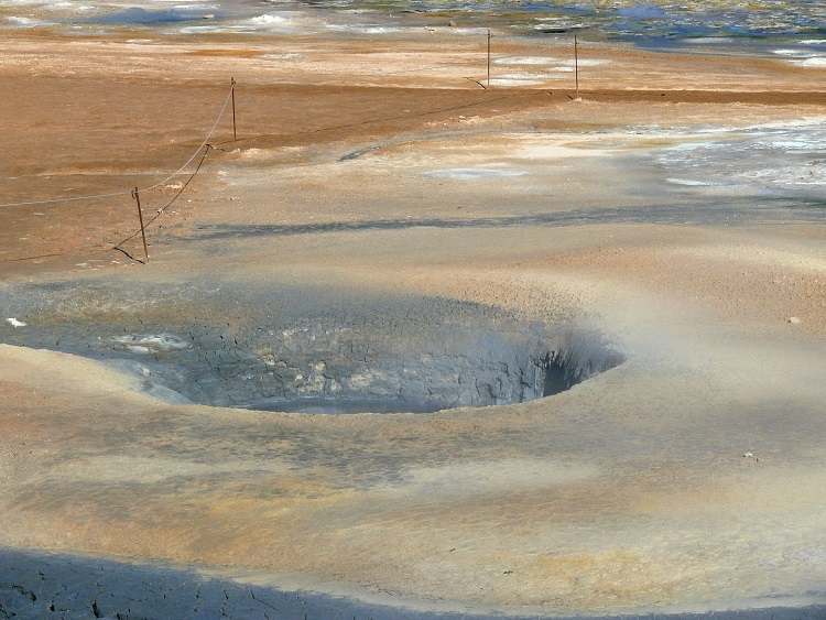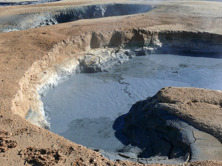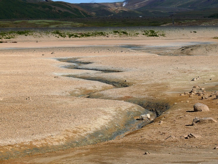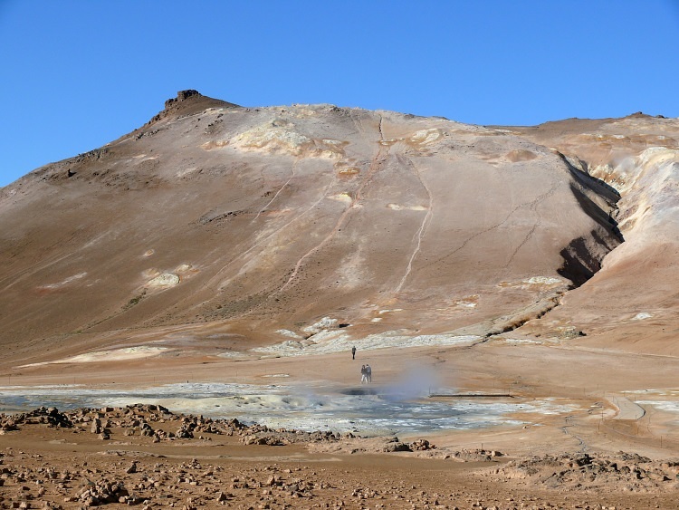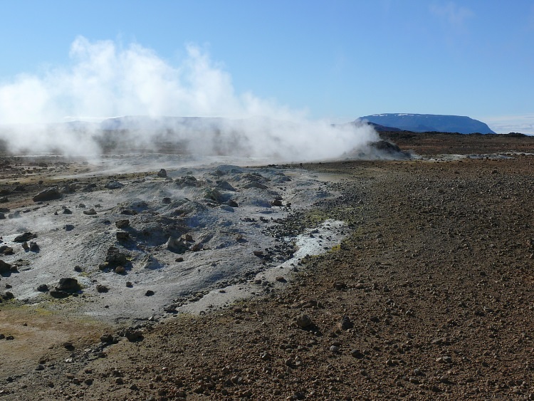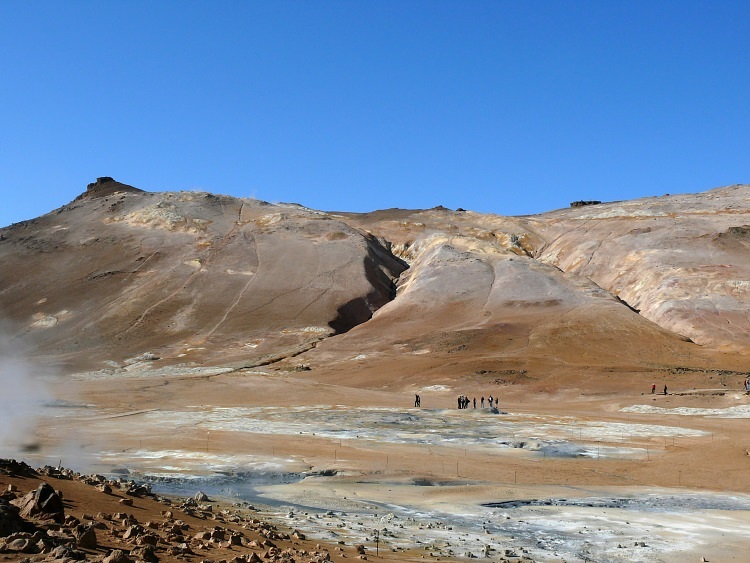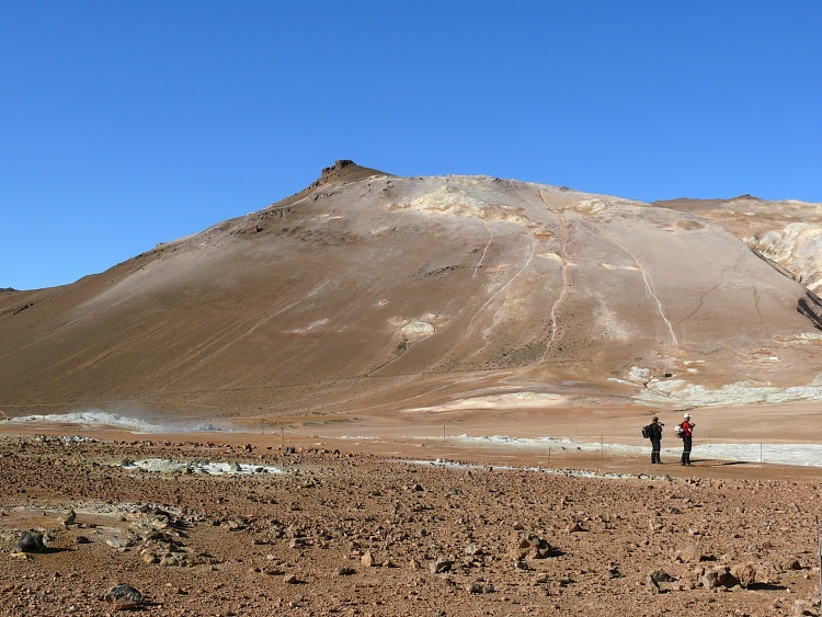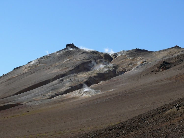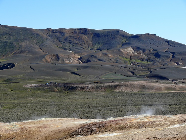 Das abwechslungsreiche Solfatarenfeld Hverarönd erreichen wir auf der Strecke Richtung Egilsstaðir kurz nach der Passhöhe Námaskarð. Im Hintergrund der aussichtsreiche, auf Wanderwegen begehbare Námafjall.