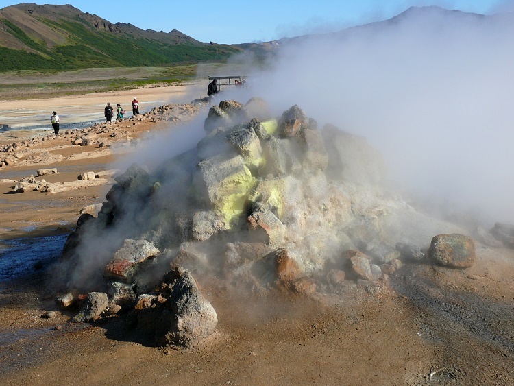 Der Solfatarenhügel mit gelben Schwefelablagerungen