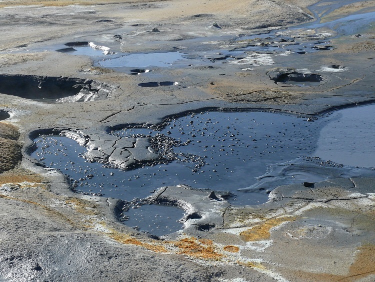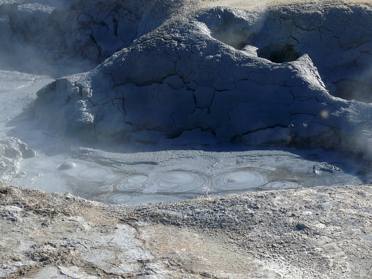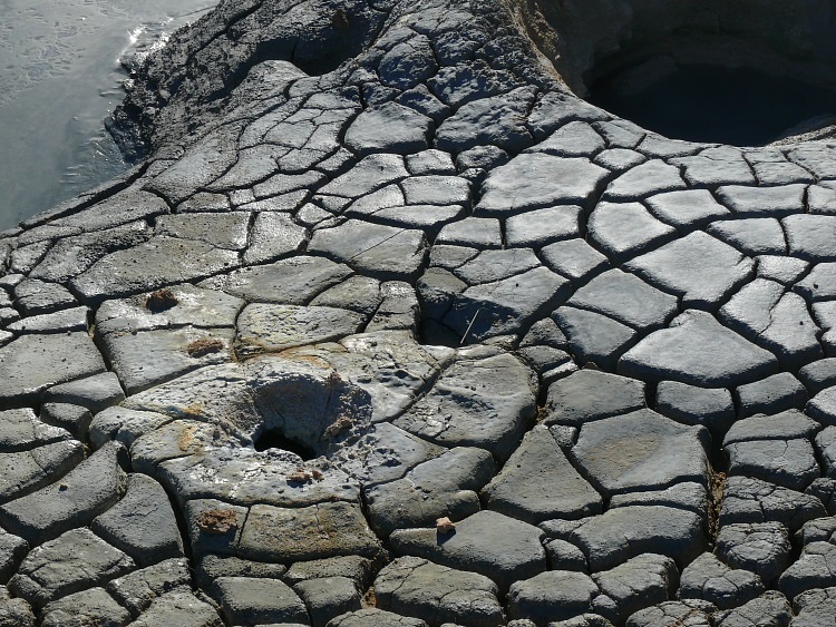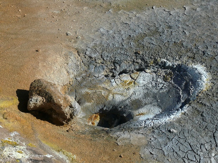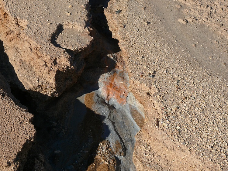 Verbackener Schlamm, in dem sich zwei kleine Fumarolen verbergen