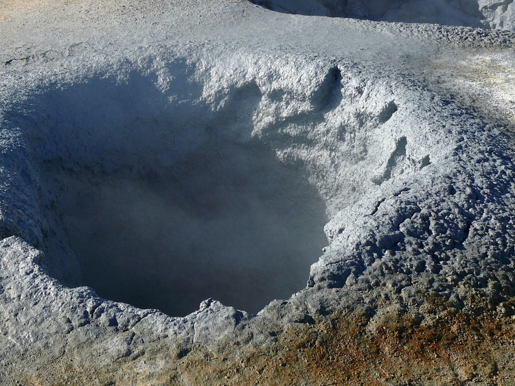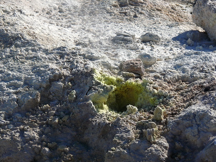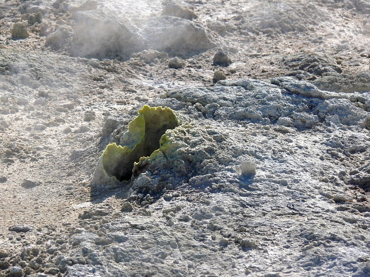 Fumarole, schwefelgelb, mit sichtbar austretendem Wasserdampf