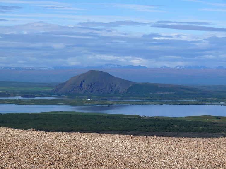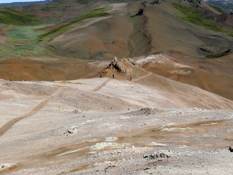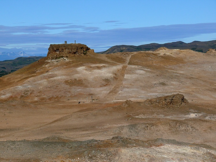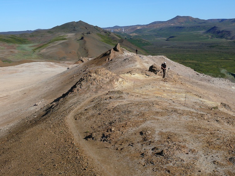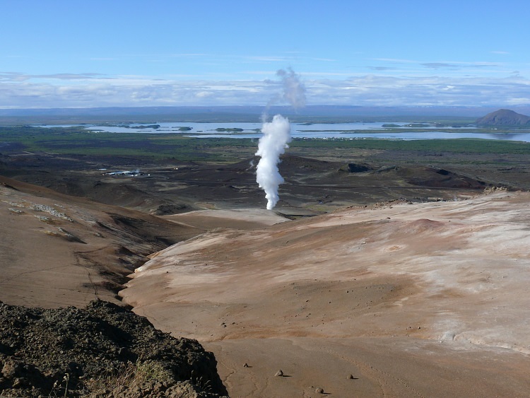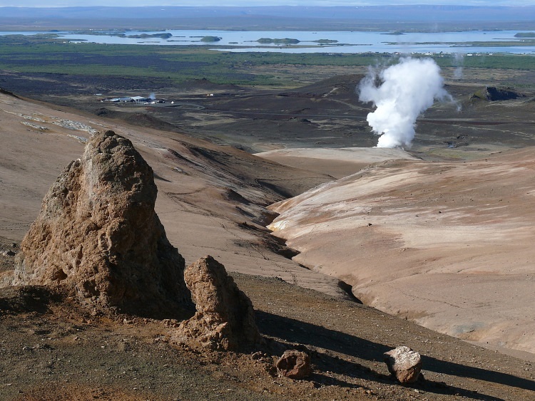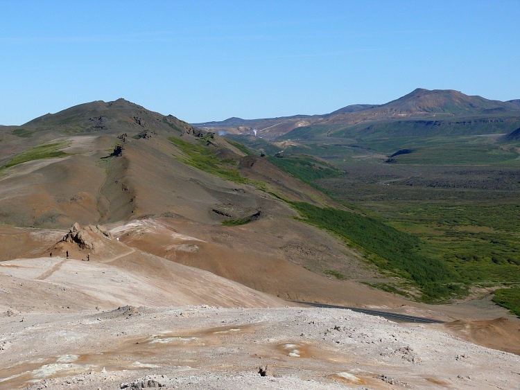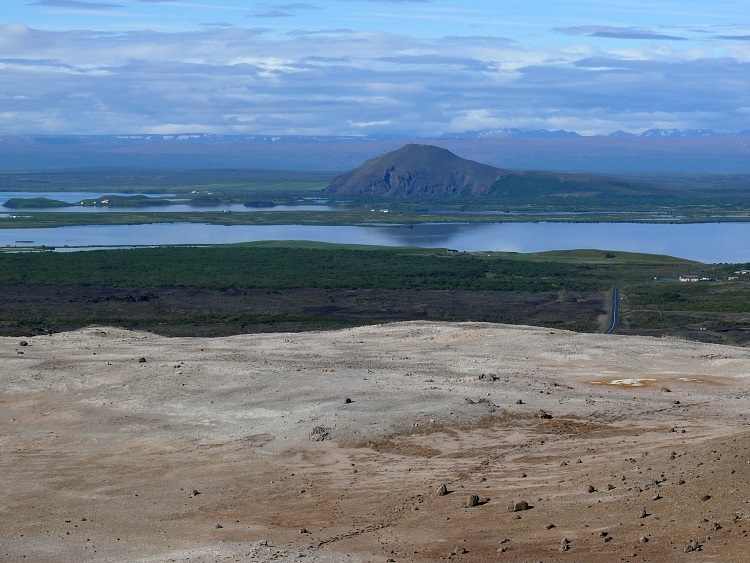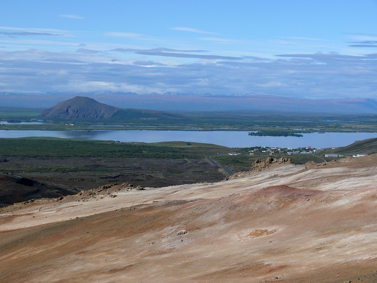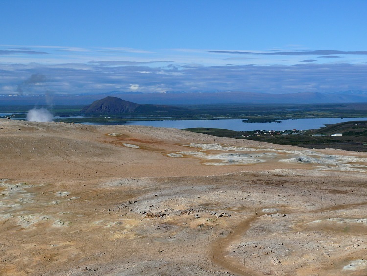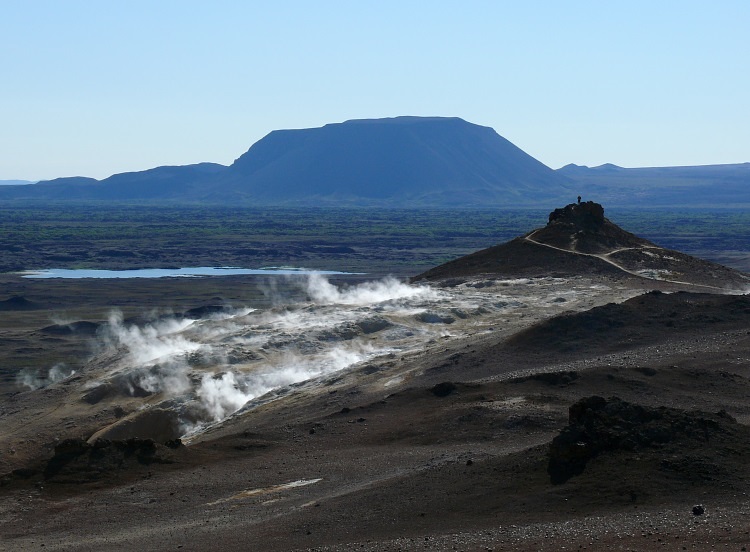 Wir wandern noch ein Stückchen weiter und erreichen schließlich eine Anhöhe oberhalb des Namaskard-Passes: Von dort reicht der Blick hinunter bis zum Mývatn-See.