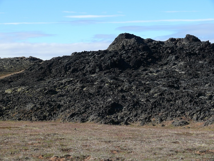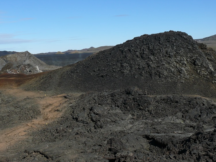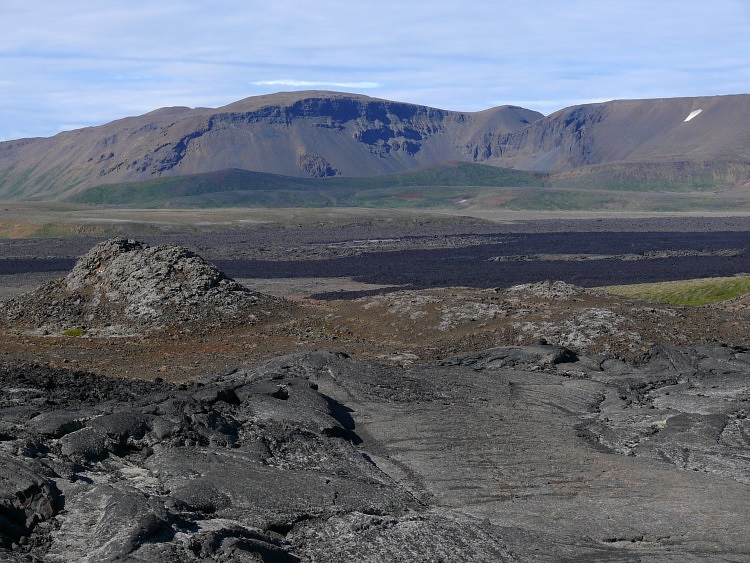 Blick über das Lavafeld. Nur einige höhere Hügel ragen aus dem Lavafluss heraus.