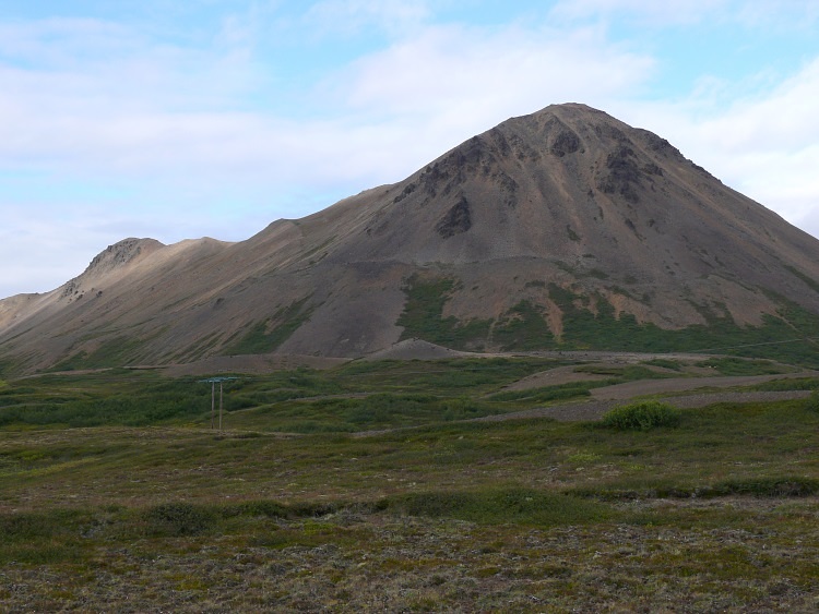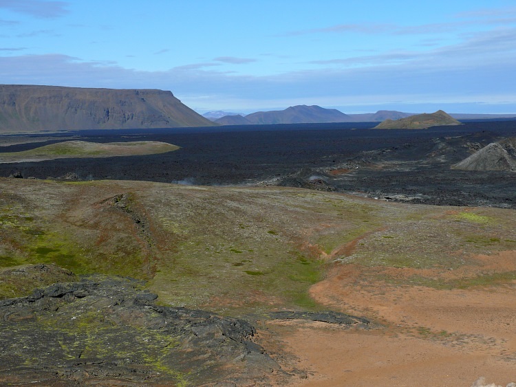 Blick auf die Passhöhe, die dahinter im Norden liegenden Berge sowie die recht jungen Lavafelder der Krafla.