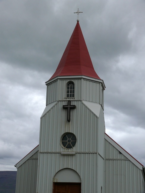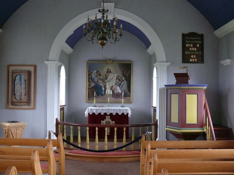 Das Innere der Kirche von Laufás mit Kanzel und Altar