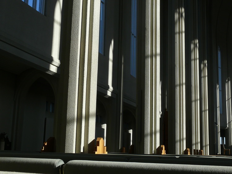 Im Inneren der Hallgrímskirkja. Durch die großen Fenster fällt viel Licht in den Innenraum.