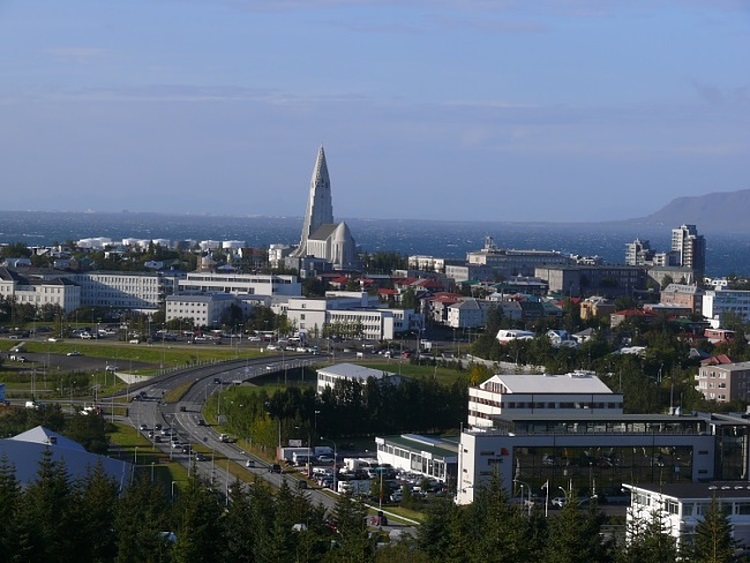 Blick über Reykjavik mit der protestantischen Háteigskirkja (mit Doppeltürmchen, links) und dem markanten Turm der Tækniskólinn (höhere Schule)